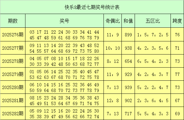 福彩夸口8第2025282期开出奖号:05 09 12 15 16 20 22 24 26 30 35 38 39 47 49 56 62 66 72 74,其中奖号奇偶比为7:13,和值为717,跨度69,五区比为5:5:4:3:3。